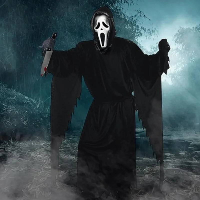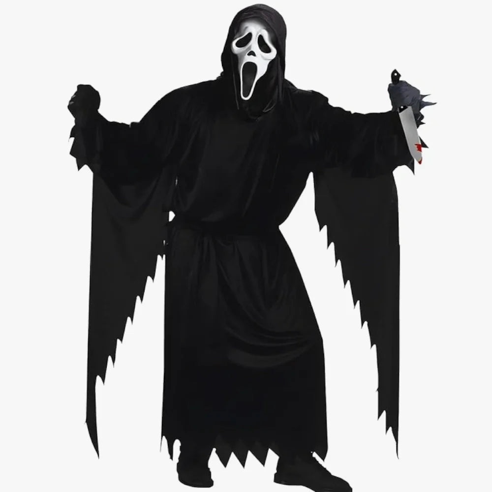 Le déguisement qui fait peur est l’arme secrète de ceux qui veulent marquer Halloween d’un vrai cri. Entre la cape noire flottante, le masque au sourire figé et le couteau factice qui ferait presque hésiter les plus courageux, ce costume transforme n’importe qui en apparition tout droit sortie d’un film d’horreur. Disponible en plusieurs tailles (S, M, L), il s’adapte à ta morphologie : que tu sois du genre mince ou plus costaud, tu trouveras la coupe qu’il faut pour semer la panique avec aisance. Mets-le, baisse la lumière… et amuse-toi à regarder tes potes sursauter dès que tu bouges d’un millimètre 😈.